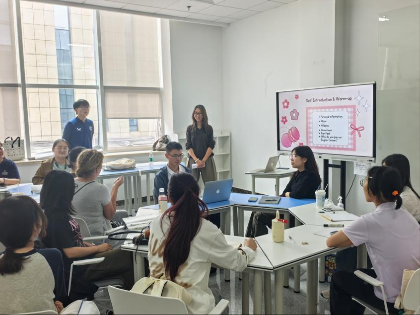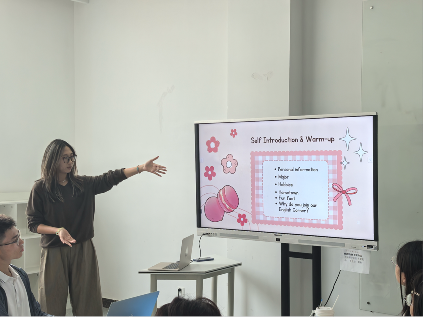 本次沙龙由青岛大学英语服务志愿者协会会长李一林主持。主持人请大家以简单的自我介绍进行热场,拉开了此次沙龙的序幕。同学们依次向大家介绍自己。现场欢声笑语,活动氛围轻松愉快,拉近了彼此的距离。
