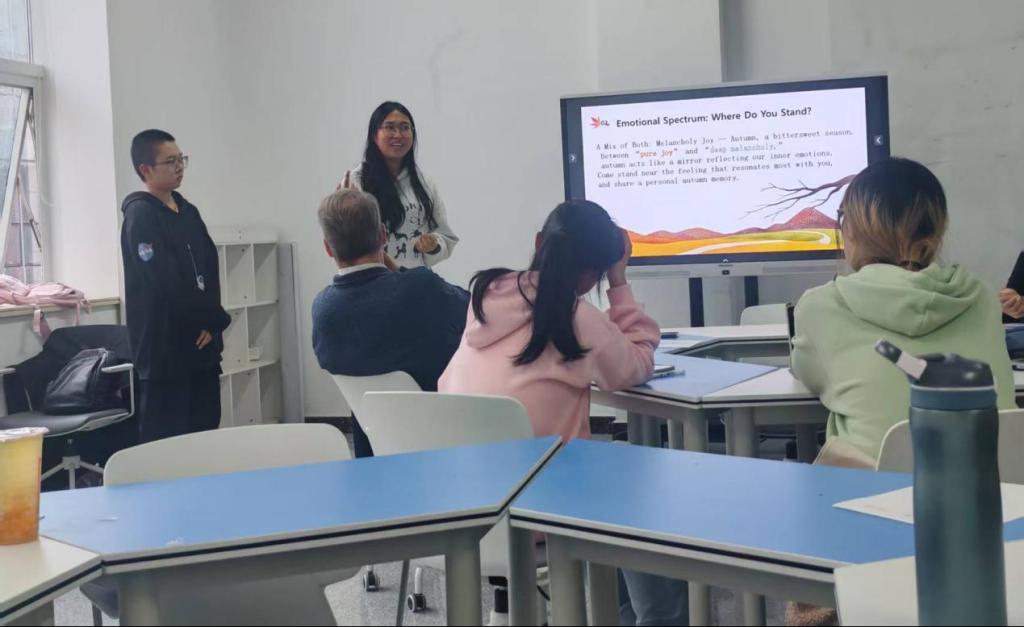 活动还设置了中西方秋日文学赏析环节。将英国诗人济慈To Autumn中描绘的秋日丰收的浪漫意象与中国马致远《天净沙·秋思》中流露的离愁别绪进行对比,共同探讨了文化背景对秋日情感表达的影响。主持人万嫭为大家解析了《天净沙·秋思》,外教Scott则讲解了To Autumn,帮助大家更深入地理解两首诗歌中所承载的秋日情感。